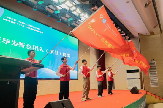 张红梅为“快乐童心”爱心托管班项目、“美丽校园”志愿服务总队、“小one”志愿服务项目、“同心同语”铸牢中华民族共同体意识实践项目、“智慧助老——朝夕相伴”志愿服务队等5支校级首批特色团队(项目)授旗。